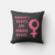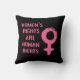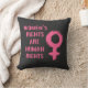 Throw pillow with a feminist message, features pink female symbol and "women's rights are human rights" text in brush stroke style font on black background.