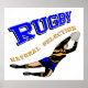 Women's Rugby Player. Female rugger leaping to catch the ball, with athlete motto: "Rugby Natural Selection". Crisp. Choose your own background colour. This drawing is available in multiple colour selections; this version is blue & gold uniform & text. If you don't see your team colours, send me a note & I'll create it for you.