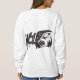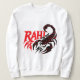 A woman's white sweatshirt featuring a bold graphic design of a scorpion in a dynamic pose.