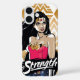 Check out Wonder Woman in front of her logo tribal pattern with "Strength" written atop a painted brush stroke.