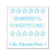 This fun rubber stamp design features the inspiring message "WONDERFUL CORRECTIONS!" and a personalised teacher's name. It also features a decorative star shape. It could be used by a school teacher, educator, instructor, or tutor when marking assignments, to indicate that a student has done well.