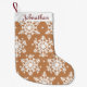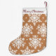 Hang these lovely Christmas stockings over your fireplace this season. This design features a brown background with big white snowflakes. Personalise today!