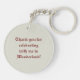Round double-sided acrylic keychain with an image of a beige and burgundy Alice in Wonderland design in the shape of a rabbit. The back is beige and has customisable text that reads “Thank you for celebrating with me in Wonderland!" See the entire Wonderland Keychain collection in the PARTY FAVORS section.