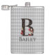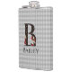 Whimsical Wonderland themed flask features vintage Alice and the Queen of Hearts character color illustrations with large letter / initial B with a black/gold/red card suites fill pattern on a vintage gray harlequin background. Personalize further with customizable name text