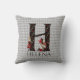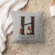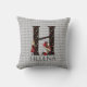 Whimsical Wonderland themed throw pillow features vintage Alice and the Queen of Hearts character colour illustrations with large letter / initial H with a black/gold/red card suites fill pattern on a vintage grey harlequin background. Personalise further with customisable name text