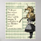 Whimsical vintage style poster with tinted original Alice illustration and golden unicorn. Quote is from Alice in Wonderland: Through the Looking Glass ""Well, now that we have seen each other,' said the Unicorn. If you'll believe in me, I'll believe in you." Distressed sage green harlequin background