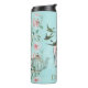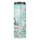 Vintage floral pastel paper in aqua soft blue green and pink features Alice in Wonderland's tea party from the children's book, with the Mad Hatter, March Hare and Dormouse, and the words Drink Me, with pink roses and leaves, text from the handwritten manuscript, and beautiful vintage swallows that seem to pour out of a teapot and fly into the sky, swirling around Alice (the White Rabbit is lurking somewhere in the foliage and shy in the background is a vintage pocket watch), making a lovely vintage British tea and literature themed thermal tumbler water bottle.