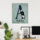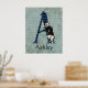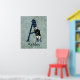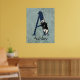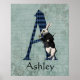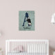 Whimsical design for Alice in Wonderland lovers of all ages features capital letter / initial A with black and blue harlequin fill and original White Rabbit illustration that has been tinted, on a distressed vintage floral and handwriting blue tinted background. Personalise with name or other message