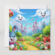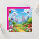 The sky is a bright blue, filled with fluffy, anthropomorphic clouds with smiling faces. A small, cheerful sun-like character and other small, playful figures can be seen in the sky as well. The overall style is bright, colourful, and very child-friendly, evoking a sense of joy and adventure in a magical land.