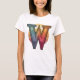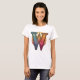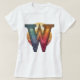 This image design a striking letter "W" designed with a captivating gradient of rainbow colours, blending seamlessly from cool blues and greens on the left side to warm reds and oranges on the right. The letter is framed with bold, clean lines that add depth and definition. The "W" is set against a circular backdrop, reminiscent of a sunset, with horizontal stripes transitioning from light yellow at the top to deeper orange at the bottom. This combination of vivid colours and geometric precision creates a modern and eye-catching design, perfect for a trendy t-shirt.