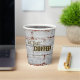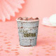 The fun phrase that coffee lovers love. "but first... COFFEE!" This whimsical design features a fresh cup of hot coffee over a brick background.