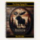 A stunning wood carving of a moose majestically poses against a backdrop of trees, showcasing nature's beauty and craftsmanship.