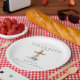 These elegant, floral baptism reception plates feature a religious watercolor image in the centre. A wood cross is accented with white and blue flowers, and delicate greenery. A sample bible verse for baptism is printed above the wooden cross.