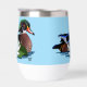 A wood duck int he water with a white water lily beside the duck in a backdrop of blue
