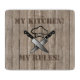 This design features a wood effect background with a graphic of two cutting knives and a chef's hat in the centre. Above the graphic it states 'My Kitchen' and below 'My Rules' written in a stencil font. The text can be changed to suit your own requirements.