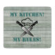 This design features a wood effect background with a graphic of two cutting knives and a chef's hat in the centre. Above the graphic it states 'My Kitchen' and below 'My Rules' written in a stencil font. The text can be changed to suit your own requirements.