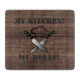 This design features a wood effect background with a graphic of two cutting knives and a chef's hat in the centre. Above the graphic it states 'My Kitchen' and below 'My Rules' written in a stencil font. The text can be changed to suit your own requirements.