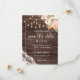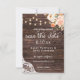 Send a save the date card to get your guests ready to celebrate your wedding or party with this wood, lace, and string lights, and blush pink & peach floral rustic or country floral save the date card.