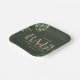 Woodland shower theme with "BABY" text in wood design letters surrounded by eucalyptus greenery and forest animals including squirrel, owl, bird, fox, deer, and hedgehog. Background is dark green.