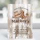 First Rodeo birthday themes invitation Kids birthdays are special, and this invite can help it make a memorable birthday party. Elegant calligraphy on lasso background surrounded by cowboy accessories: hat, sheriff's badge and boots with spurs on a blue background.
