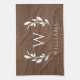 Wood Wreath Initial Monogram Last Name kitchen towel features a background of brown walnut faux wood, with your last name and initial.