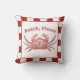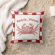 Woodcut crab on a red and white chequerboard with the pun "Beach, please." Text is customisable.