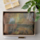 This tissue paper features a 1902 oil painting by Hans Andersen Brendekilde, the essence of the fall season: shades of brown, orange, yellow; winds of change. 'Wooded Path in Autumn' is a seasonal classic artwork featuring a woman sitting on a bench surrounded by fall leaves in mostly warm colours and a body of water nearby.