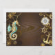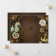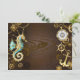 Brown wooden background with sea, mechanical ridge, an antique steering wheel, golden anchor and various gold and brass gears. Steampunk style.