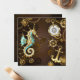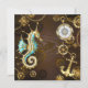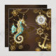 Brown wooden background with sea, mechanical ridge, an antique steering wheel, golden anchor and various gold and brass gears. Steampunk style.