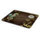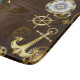 Brown wooden background with sea, mechanical ridge, an antique steering wheel, golden anchor and various gold and brass gears. Steampunk style.