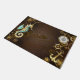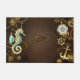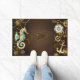 Brown wooden background with sea, mechanical ridge, an antique steering wheel, golden anchor and various gold and brass gears. Steampunk style.