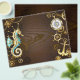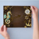 Brown wooden background with sea, mechanical ridge, an antique steering wheel, golden anchor and various gold and brass gears. Steampunk style.