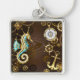 Brown wooden background with sea, mechanical ridge, an antique steering wheel, golden anchor and various gold and brass gears. Steampunk style.