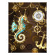 Brown wooden background with sea, mechanical ridge, an antique steering wheel, golden anchor and various gold and brass gears. Steampunk style.
