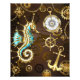 Brown wooden background with sea, mechanical ridge, an antique steering wheel, golden anchor and various gold and brass gears. Steampunk style.