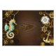 Brown wooden background with sea, mechanical ridge, an antique steering wheel, golden anchor and various gold and brass gears. Steampunk style.