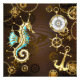 Brown wooden background with sea, mechanical ridge, an antique steering wheel, golden anchor and various gold and brass gears. Steampunk style.
