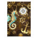 Brown wooden background with sea, mechanical ridge, an antique steering wheel, golden anchor and various gold and brass gears. Steampunk style.