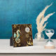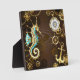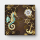 Brown wooden background with sea, mechanical ridge, an antique steering wheel, golden anchor and various gold and brass gears. Steampunk style.