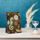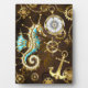 Brown wooden background with sea, mechanical ridge, an antique steering wheel, golden anchor and various gold and brass gears. Steampunk style.