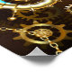 Brown wooden background with sea, mechanical ridge, an antique steering wheel, golden anchor and various gold and brass gears. Steampunk style.