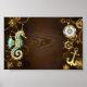 Brown wooden background with sea, mechanical ridge, an antique steering wheel, golden anchor and various gold and brass gears. Steampunk style.