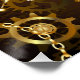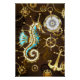 Brown wooden background with sea, mechanical ridge, an antique steering wheel, golden anchor and various gold and brass gears. Steampunk style.