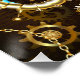 Brown wooden background with sea, mechanical ridge, an antique steering wheel, golden anchor and various gold and brass gears. Steampunk style.