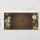 Brown wooden background with sea, mechanical ridge, an antique steering wheel, golden anchor and various gold and brass gears. Steampunk style.