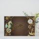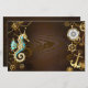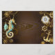 Brown wooden background with sea, mechanical ridge, an antique steering wheel, golden anchor and various gold and brass gears. Steampunk style.