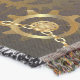 Brown wooden background with sea, mechanical ridge, an antique steering wheel, golden anchor and various gold and brass gears. Steampunk style.