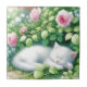 Sweet white kitten sleeping under a rose bush full of pink roses. Ai art done in a watercolor style.