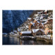 Photo print of the facades of the wooden houses at the lakeside of Hallstätter See lake under a layer of fresh snow in winter in Hallstatt, Austria.