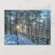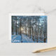 Wooden path across snowy winter forest postcard